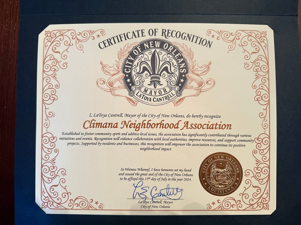 The Climana Neighborhood Association received a Certificate of Recognition from the City of New Orleans. The Association is recognized for fostering community spirt and addressing local issues through various initiatives and events.